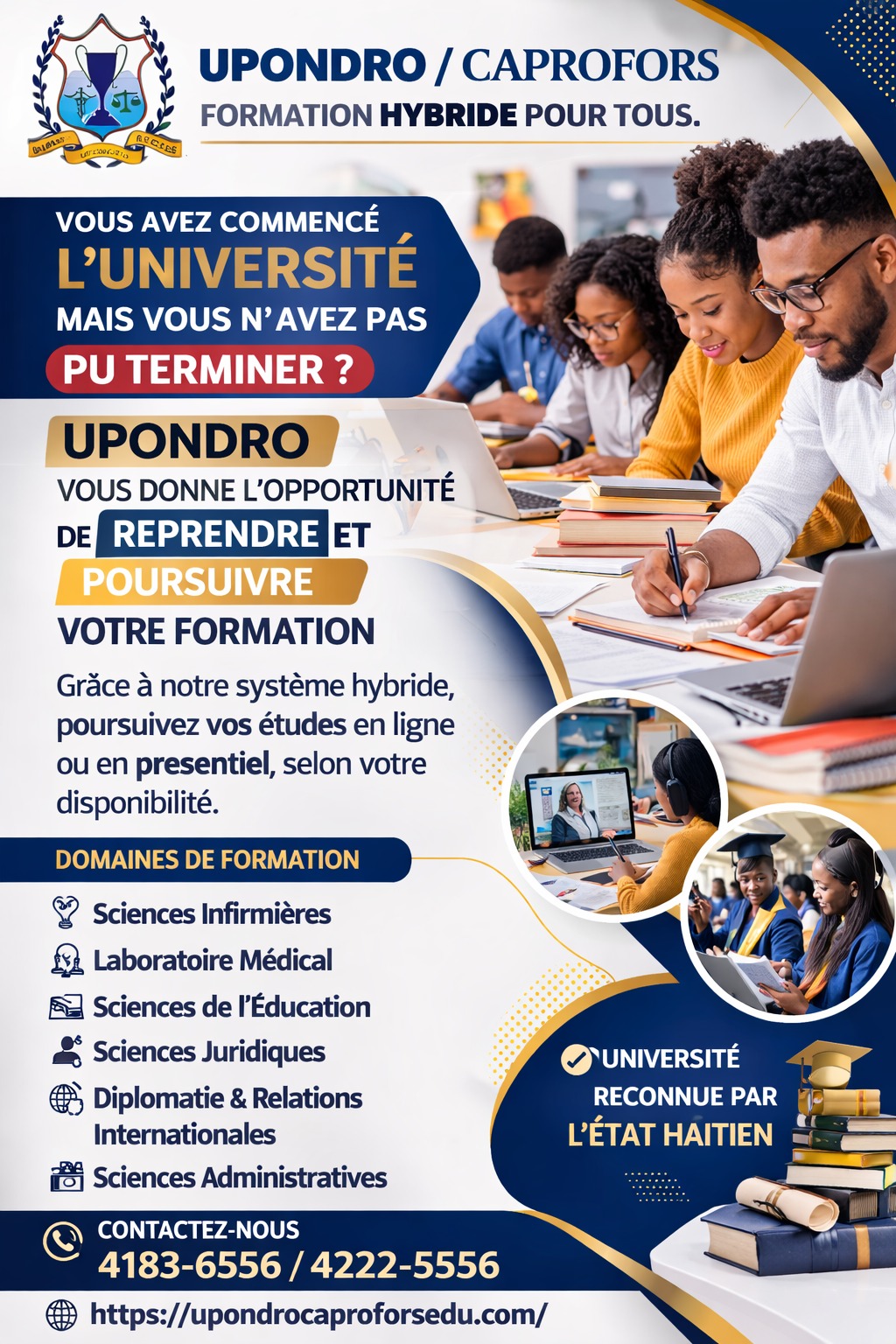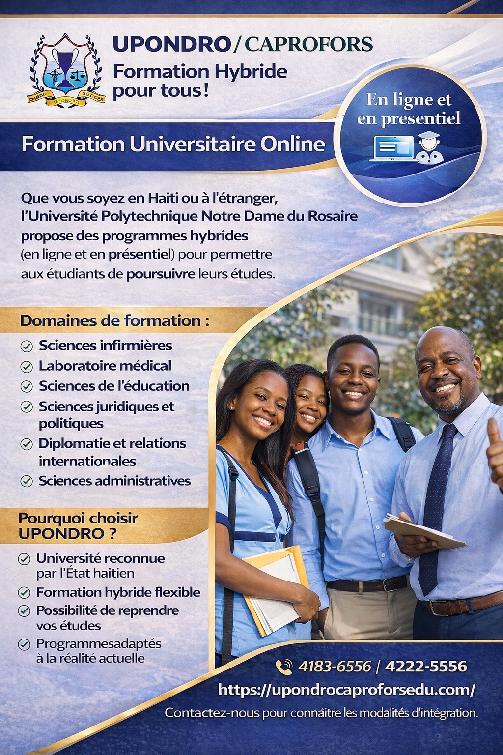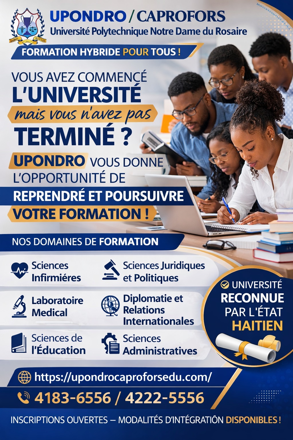 L’Université Polytechnique Notre-Dame du Rosaire (UPONDRO) est un établissement d’enseignement supérieur fondé en 2014 et reconnu par le Ministère de l’Éducation Nationale et de la Formation Professionnelle (MENFP) depuis 2016. Elle a pour mission de former des professionnels compétents, capables de répondre aux exigences du marché du travail.